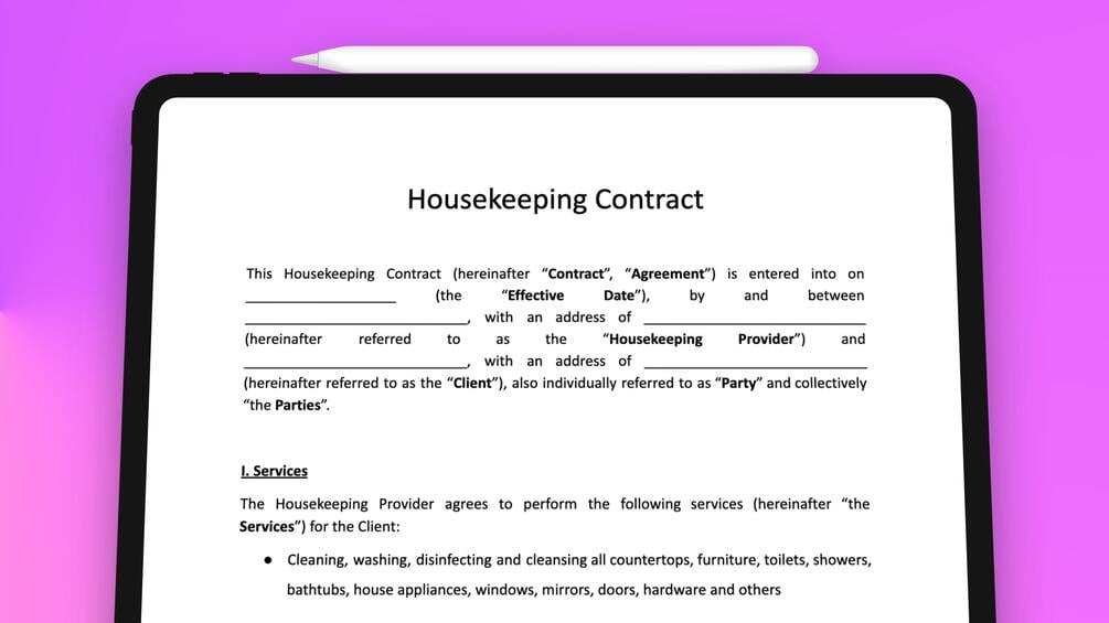 Housekeeping Contract Template (DOCX)£0+£0+https://schema.org/InStockgbpSignHouseSignHouseName a fair price:£I want this!Size466 KBAdd to wishlist New wishlistShare on XShare on Facebook Copy linkCopy product URL
